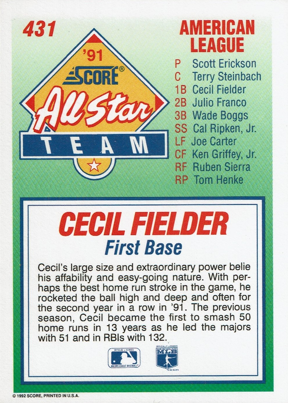 Remember when the back of the cards were almost as cool if not cooler than the front? All in all, you have one base card with three(!) different player photos. And one of them is an action shot of Fielder playing the field! Nice work, fellas.